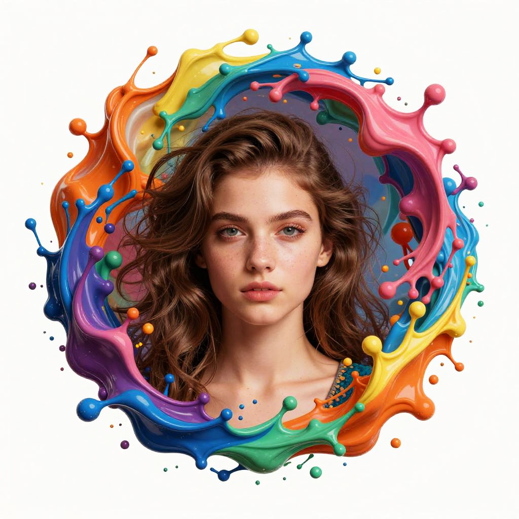 Masterpiece, best quality, [(white background:1.5), ::5] (circle), framing, 1girl in dynamic pose, (beautiful detailed colorful splash art:1.4), rotational symmetry, (beautiful face, portrait shot:1.1), (realistic, photorealistic:1.1)