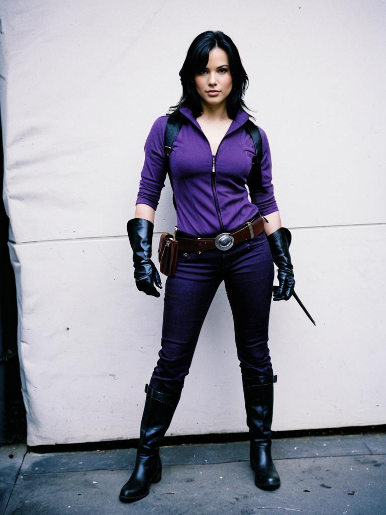 Full-length portrait of a woman wearing a Kate Bishop inspired costume featuring a purple zip-up shirt, dark pants, black knee-high boots, black gloves, and a brown belt with a pouch. She has black hair and stands confidently against a plain light background while looking directly at the camera.
