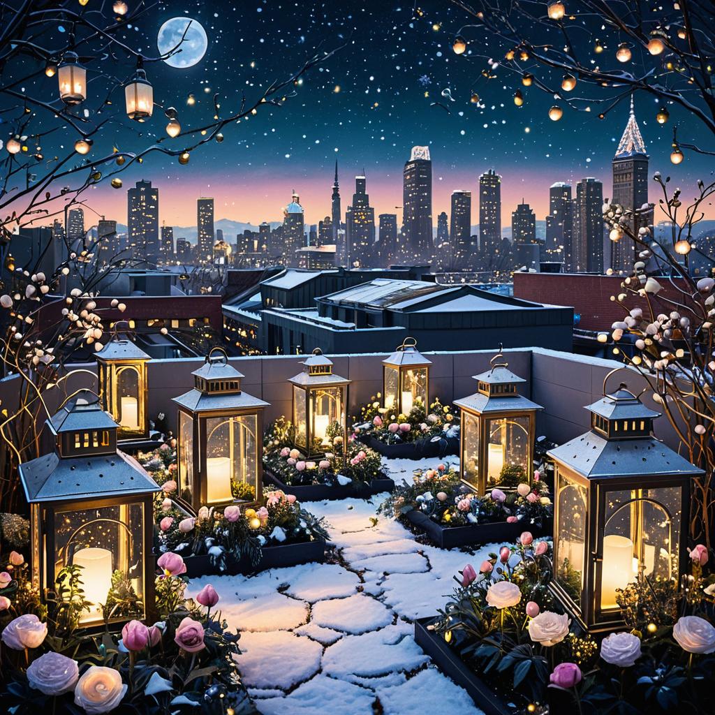 Metallic pastel tones, urban rooftop garden with modern sculptures and flowers, winter theme, night sky full of stars, glowing lanterns, in the style of Camilla d’Errico, Thomas Kinkade. Photorealistic, hyper-detailed, epic light, golden sparkling lights.