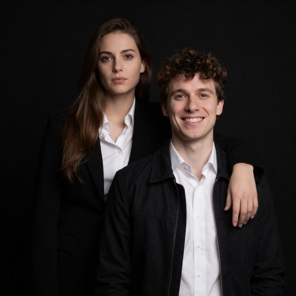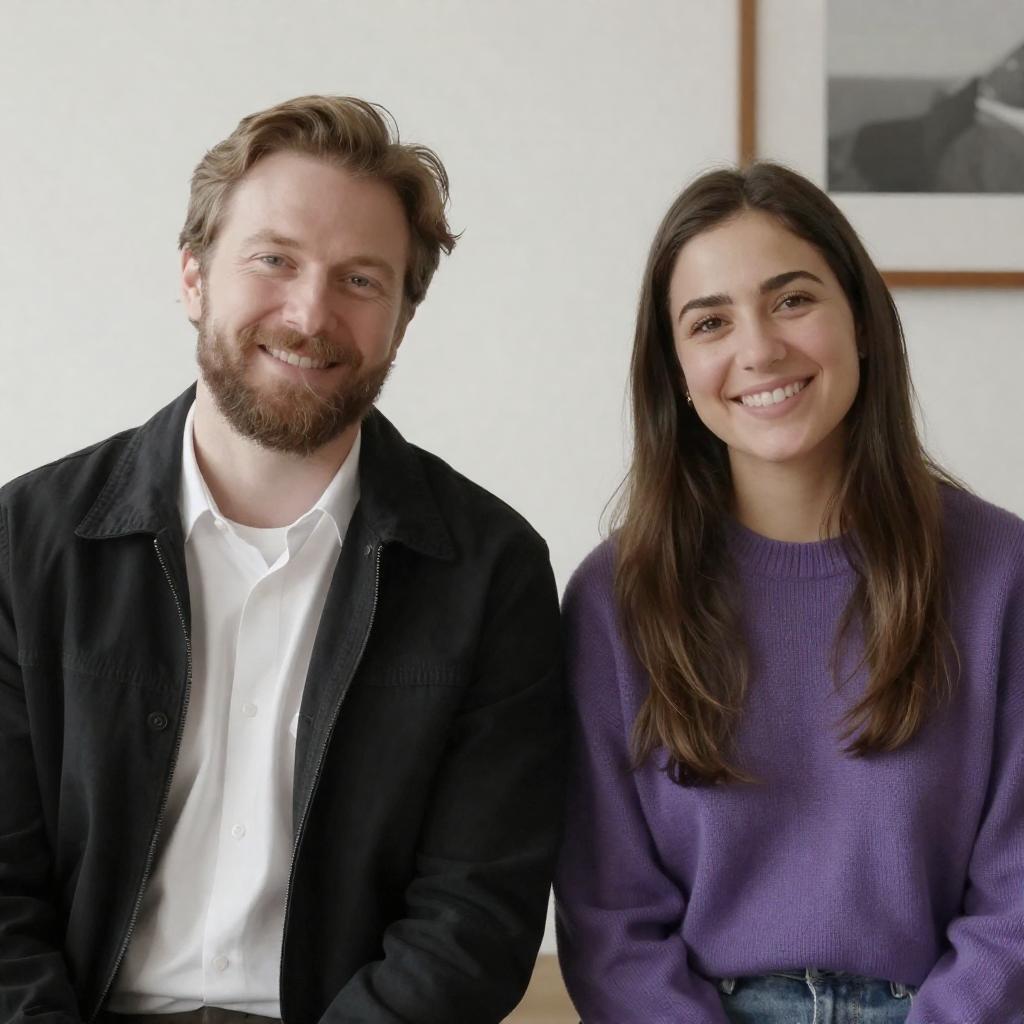 Photograph of a smiling bald man with a beard in a blue shirt and jeans, and a smiling woman with long brown hair in a red sweater and blue jeans, sitting side by side. Background has a beige wall and window.