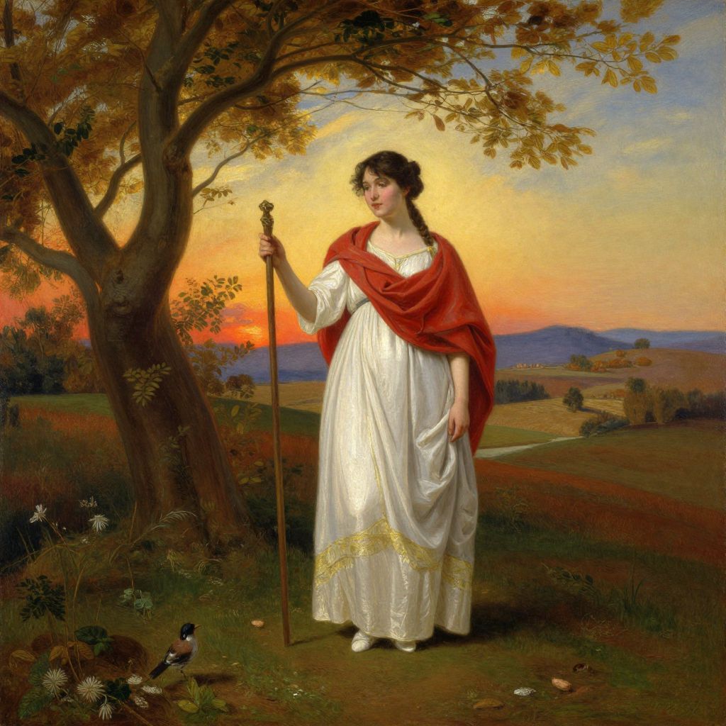 Painting of a fair-skinned woman in a white gown and red shawl, holding a staff, standing under a tree at sunset, with a