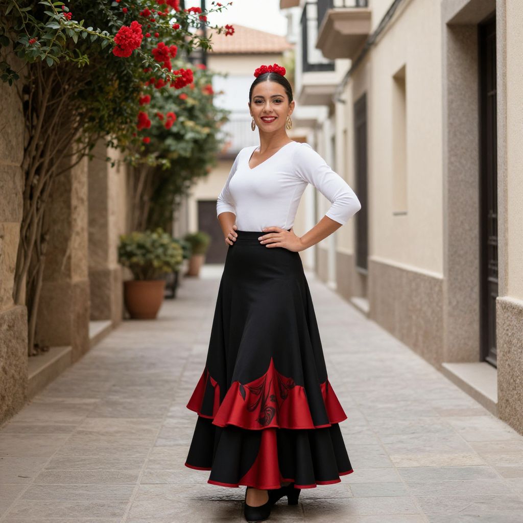 Spanish Dance Dress Costume, woman in traditional dress standing in narrow alleyway with red flowers