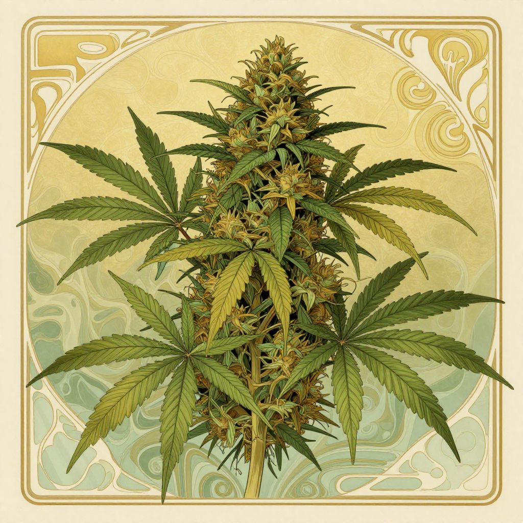 Cannabis botanical illustration combining realism and art nouveau influences, fluid lines and organic shapes, lush green and golden hues, highly detailed depiction of leaves and buds, subtle gradient background, elegant framing resembling old botanical prints