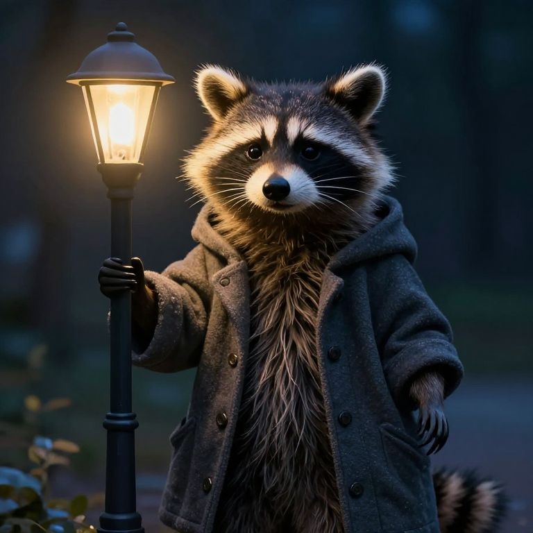 A sentient raccoon, cloaked in a coat and holding a glowing streetlamp, stands as a whimsical guardian of the night, its fur aglow with an otherworldly luminescence.