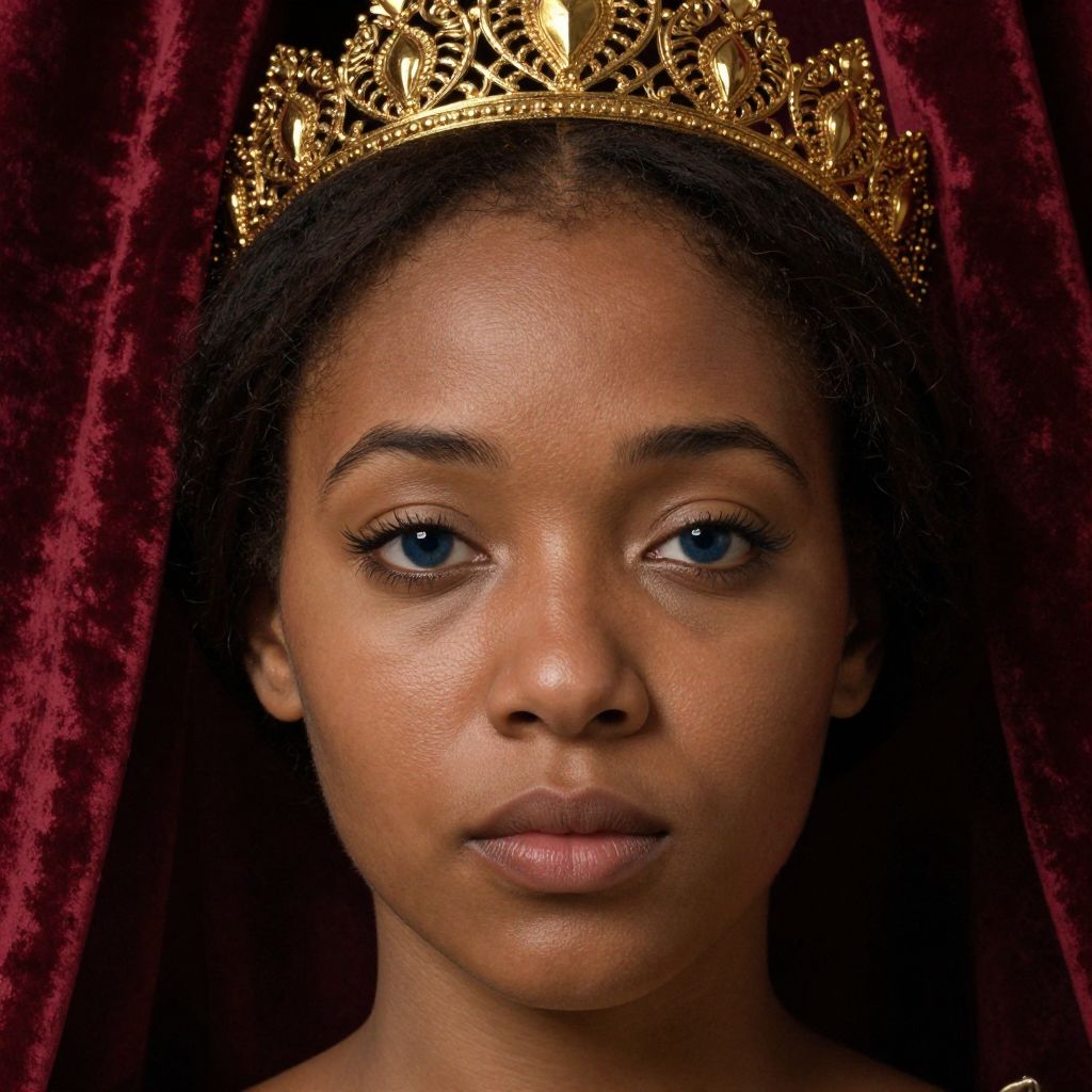 Photograph of a young Black woman with a medium brown skin tone, blue eyes, and natural, straight black hair. She wears a golden, ornate crown on her head and stands against a rich, red velvet curtain backdrop. Her expression is calm and neutral, with slightly parted lips. The image is a close-up portrait, focusing on her face, which is centered in the frame. The lighting highlights her smooth skin texture and the intricate details of the crown. The overall mood is regal and dignified.