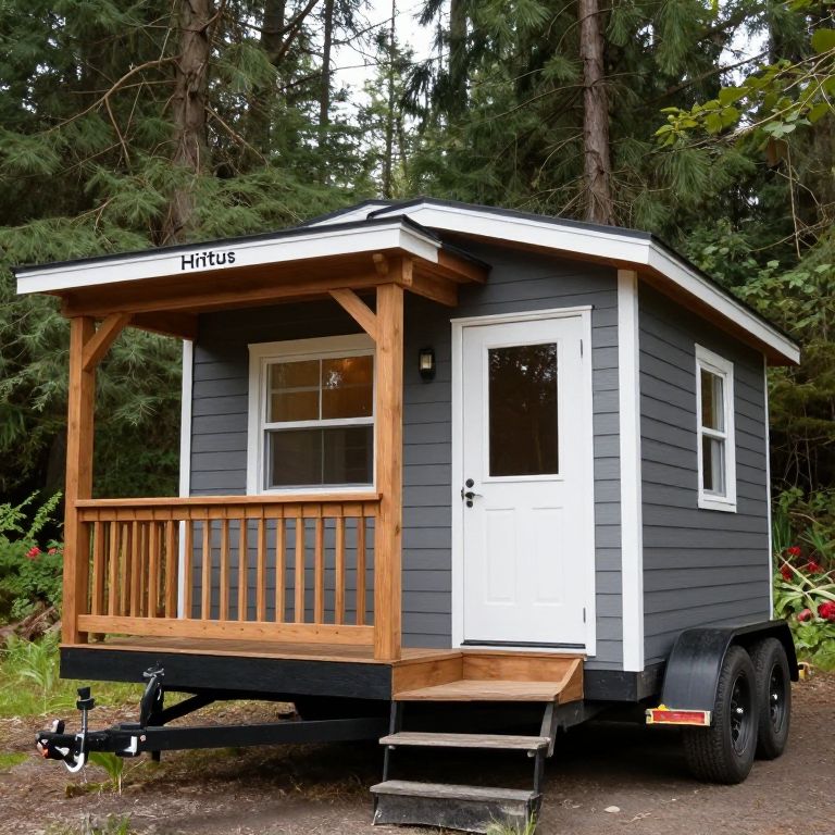 Tongue-and-groove \"Hiatus\" tiny house in Bend, Oregon, featuring a charming wooden porch with railings, gray siding, and a white door, parked on a trailer with dual wheels amidst a forested backdrop.