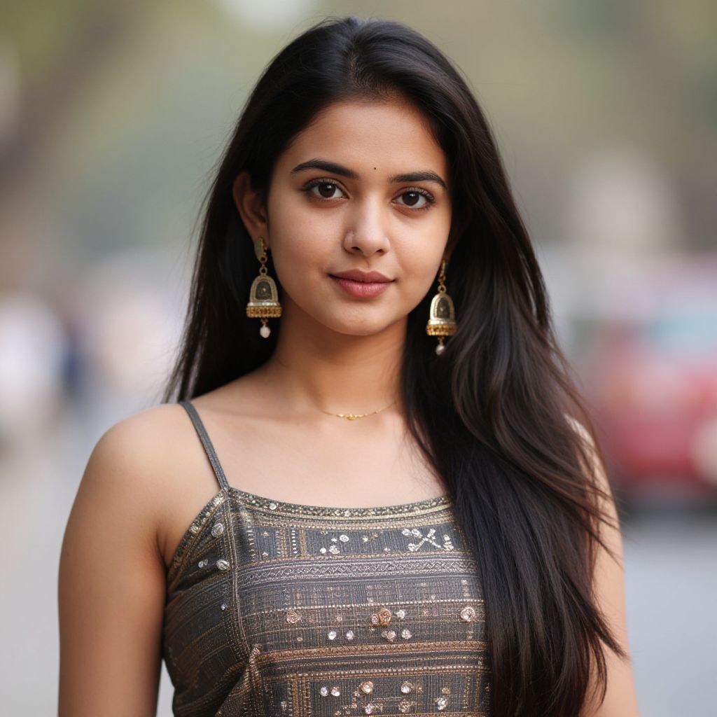Photograph of an Indian woman with long black hair, wearing a sparkly gray tank top and gold dangling earrings, standing outdoors with a blurred street background