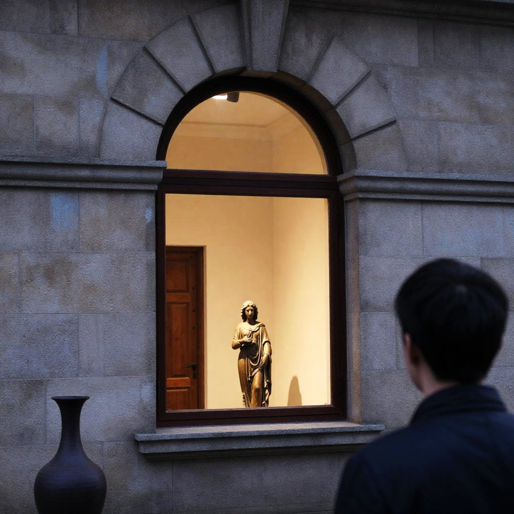 Photograph of a stone building with an arched window. Inside, a statue stands near a wooden door. Foreground shows the back of a man's head. Dark vase on the left. Warm indoor light contrasts with cooler outdoor light.