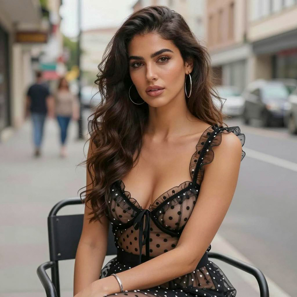 Photograph of a woman with long, wavy brown hair, wearing a black, spaghetti-strap, polka-dot dress with a low neckline. She has fair skin, dark eyeliner, and pearl earrings. She is sitting on a black chair on a cobblestone street with blurred buildings in the background. Her left hand rests on her thigh, and she wears a silver bracelet on her right wrist. She has an intense gaze and slightly parted lips.