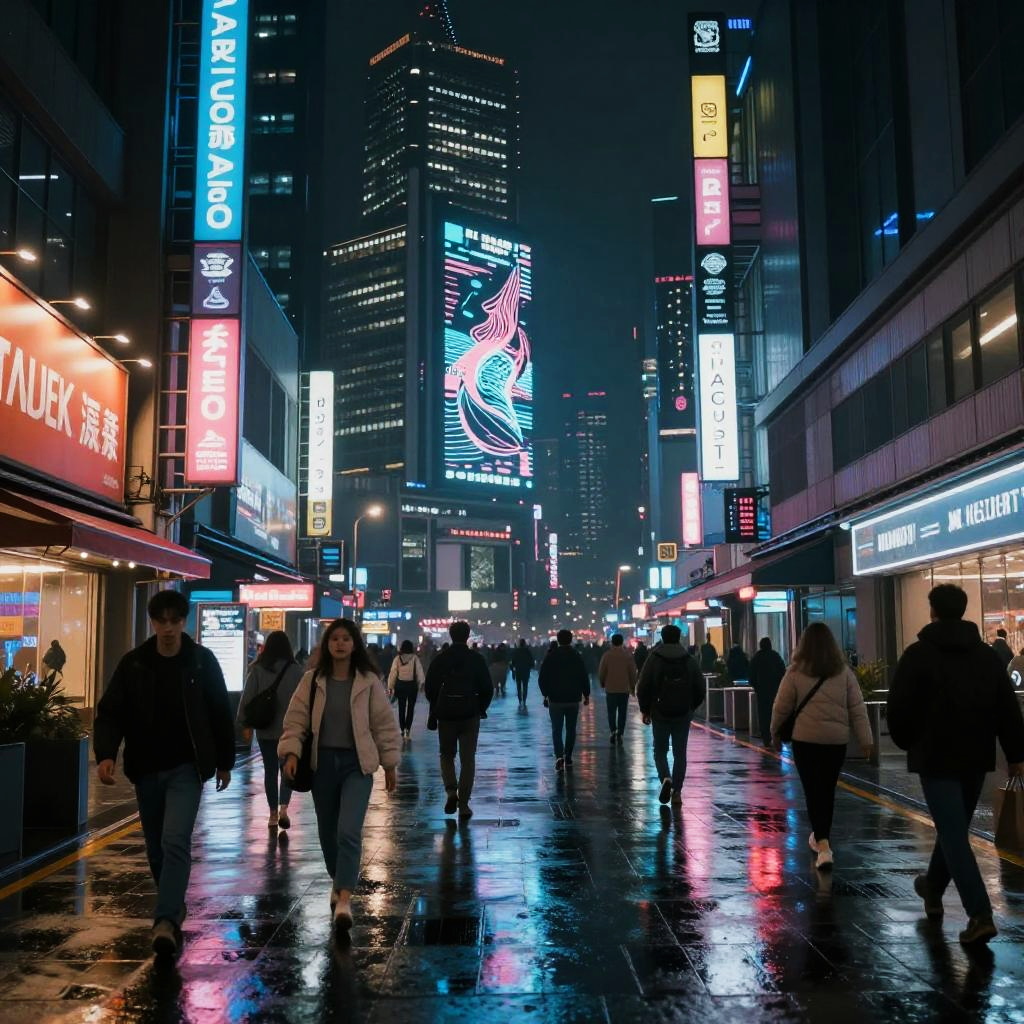 Theirfore: a bustling cyberpunk city at night, neon signs reflecting in rain-soaked streets, diverse futuristic inhabitants, towering skyscrapers with holographic advertisements, intense atmosphere