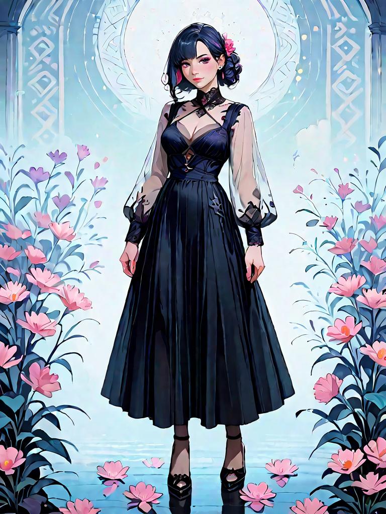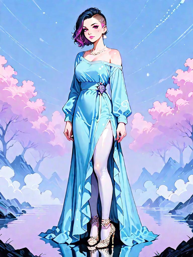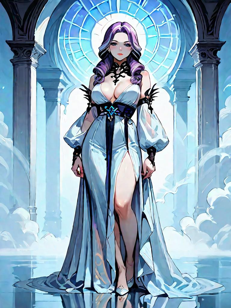 Digital artwork of a full-body dark fantasy female character standing in a misty architectural setting with arched columns and a luminous circular window. She has purple hair and wears a long, flowing light blue and black gown with a deep neckline, thigh-high slit, billowy sleeves, and intricate detailing. The scene captures a mystical and romantic atmosphere with fog and soft lighting.