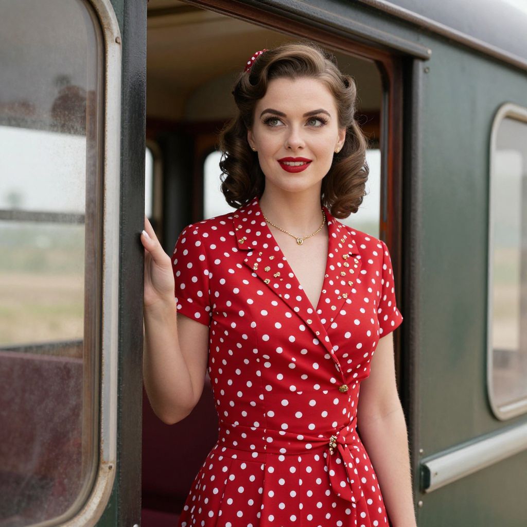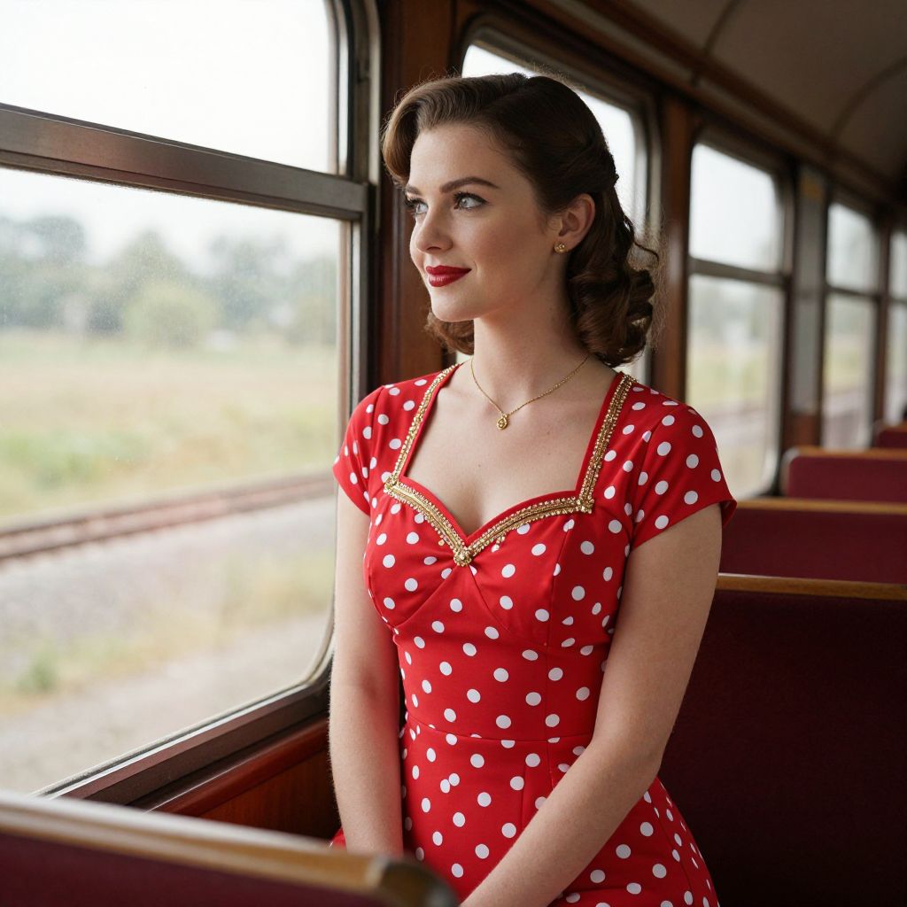 Elegantly poised within the vintage ambiance of a railway carriage, a woman in a vibrant red polka-dot dress adorned with gold embellishments gazes thoughtfully out the window, her radiant smile and classic hairstyle capturing the timeless charm of retro fashion and youthful beauty.