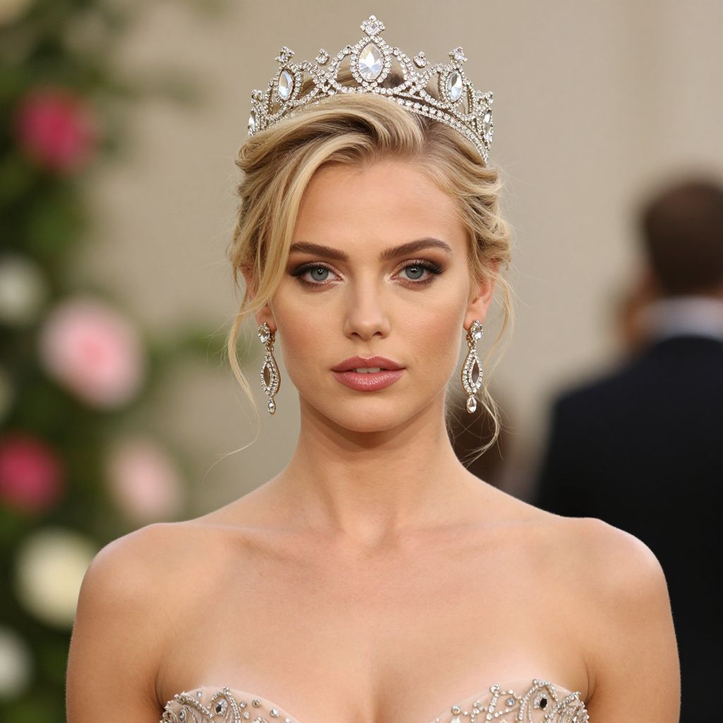 Photograph of a blonde woman with blue eyes, wearing a sparkling tiara, diamond earrings, and a strapless, bejeweled gown,