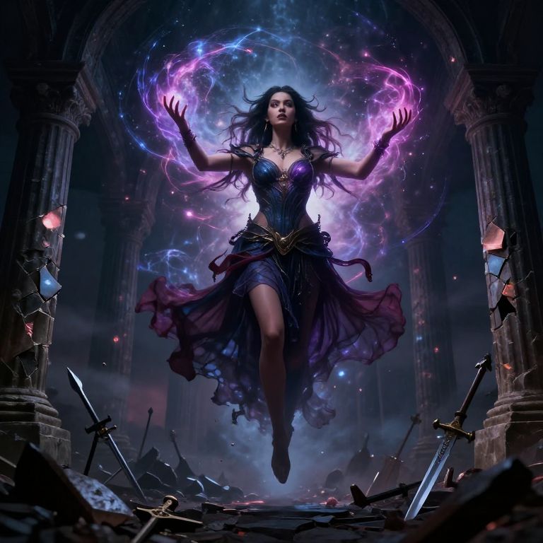 Digital artwork of a powerful, dark-haired sorceress with glowing purple and blue magical rings, floating mid-air in a ruined, sword-strewn