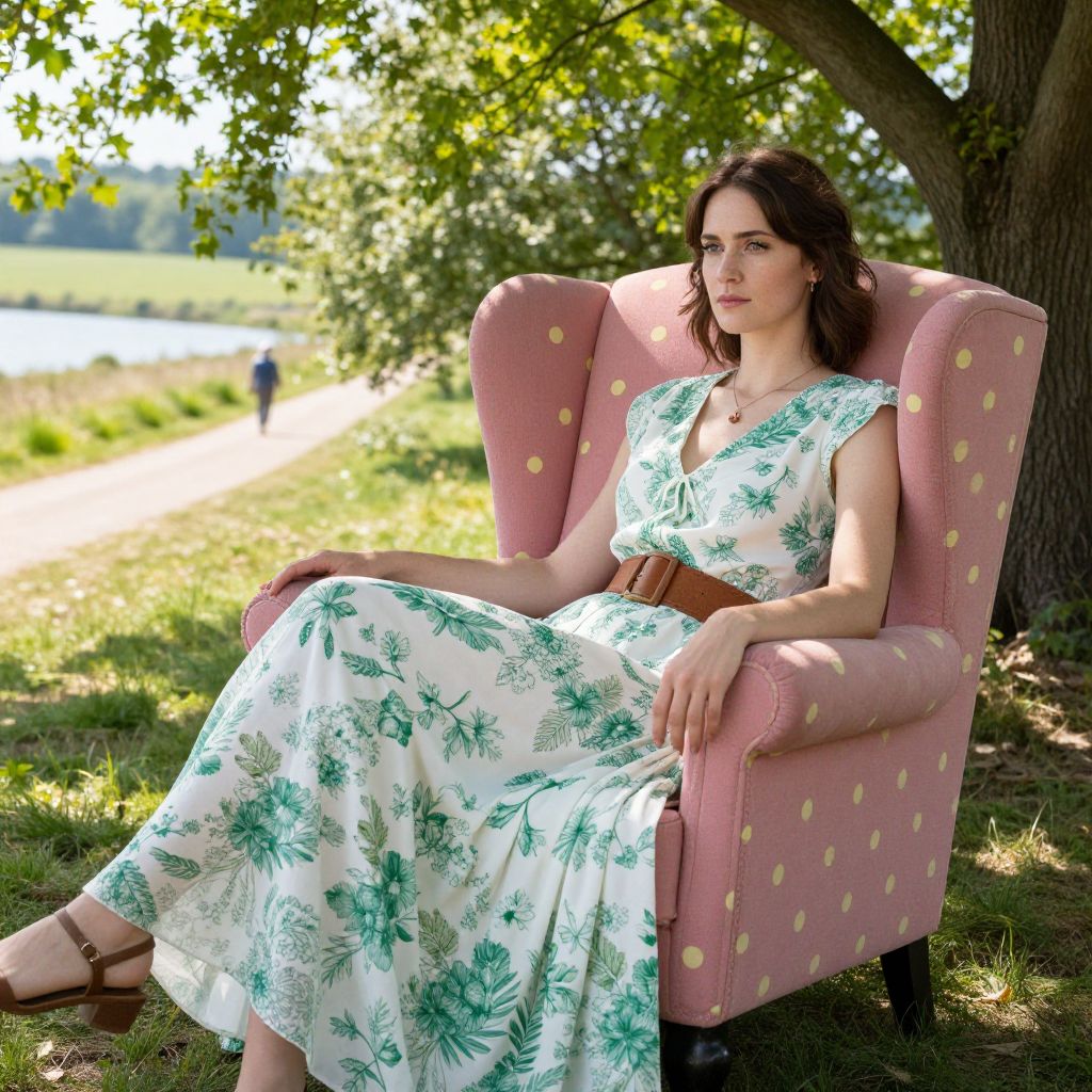 Seated gracefully in a vibrant pink armchair adorned with yellow polka dots, a woman in a flowing white dress featuring green floral patterns and a brown belt gazes thoughtfully to her right, framed by lush green trees and a serene countryside landscape that includes a distant figure walking along a path near a body of water.