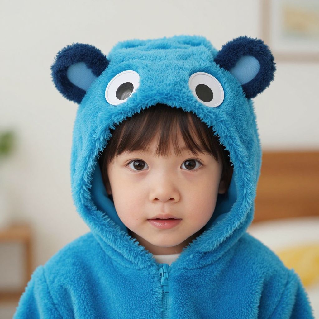 Blue Huggy Wuggy Costume, a close up of a child wearing a blue costume with googly eyes