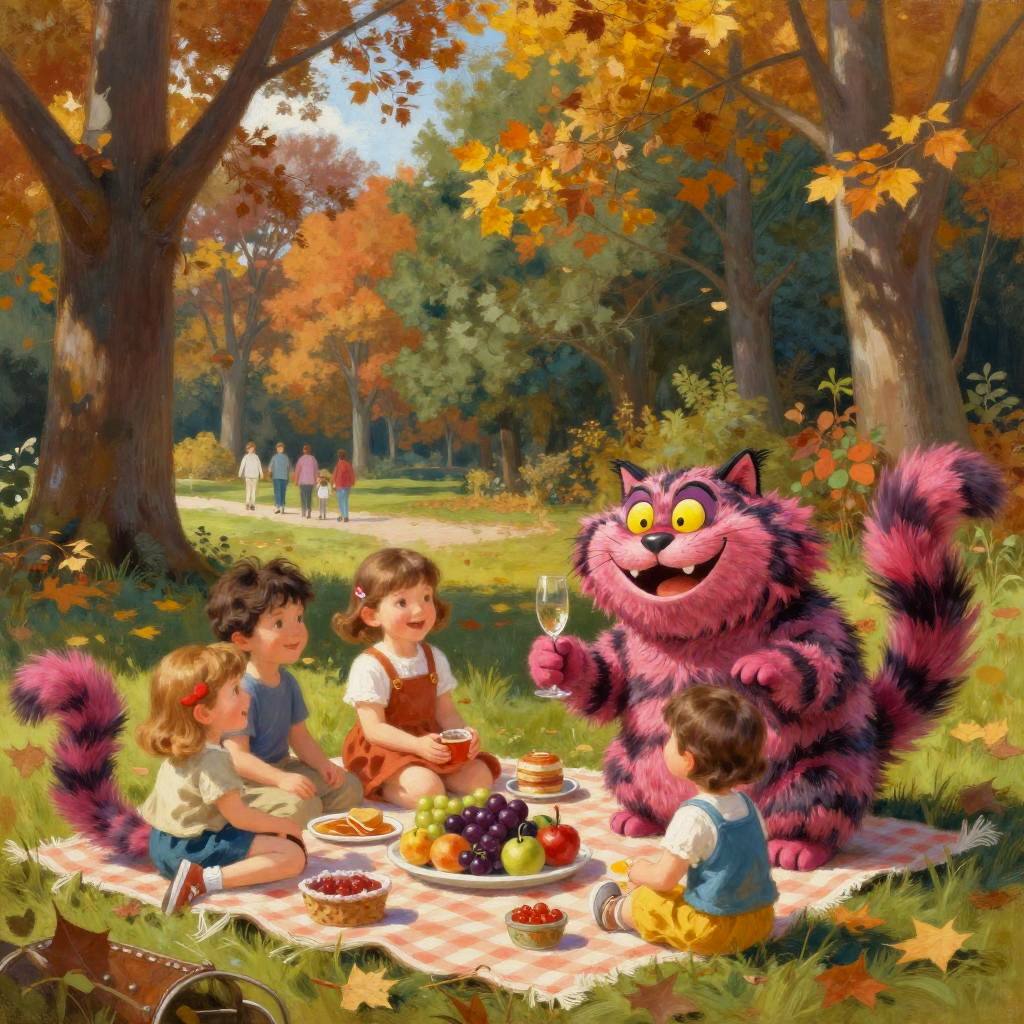 Cheshire cat A happy family enjoying a picnic in an autumn park, realistic painting, Norman Rockwell style, warm tones, 8k