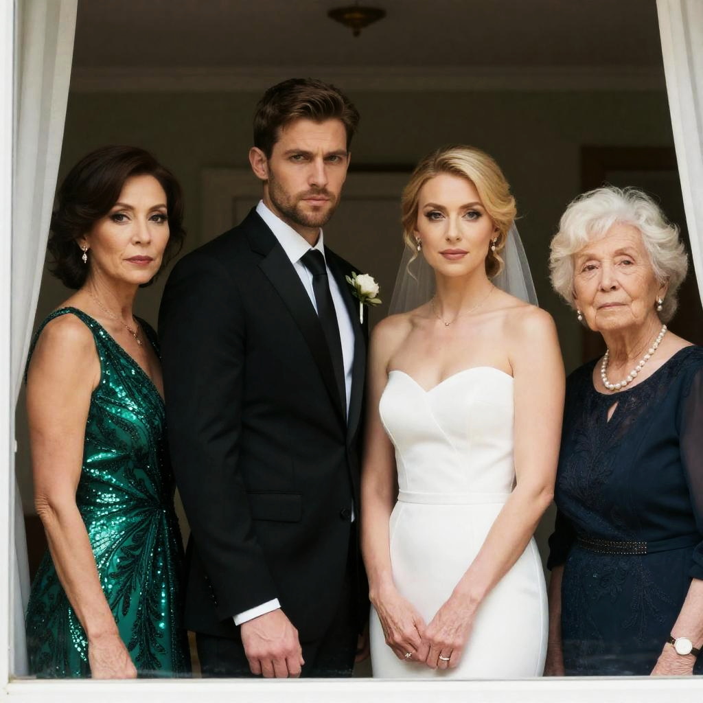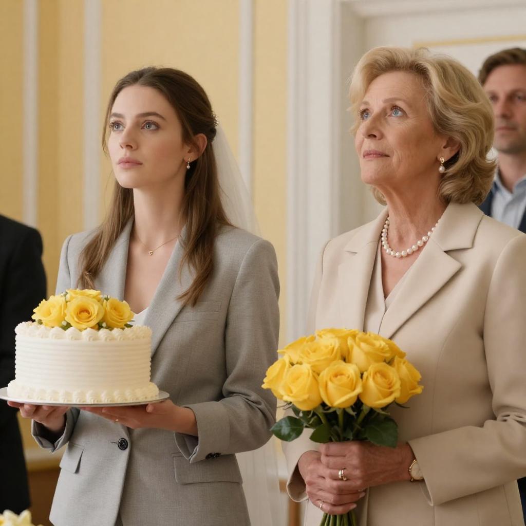 Photograph of two women standing indoors. Blonde woman in black off-shoulder dress, holding a glass, smiling. Older woman with curly brown hair, white shawl, black dress, holding a glass, neutral expression. Background: decorated with flowers, candles, fairy lights. Both women centered, slightly apart, facing forward. Foreground: blurred floral arrangements.