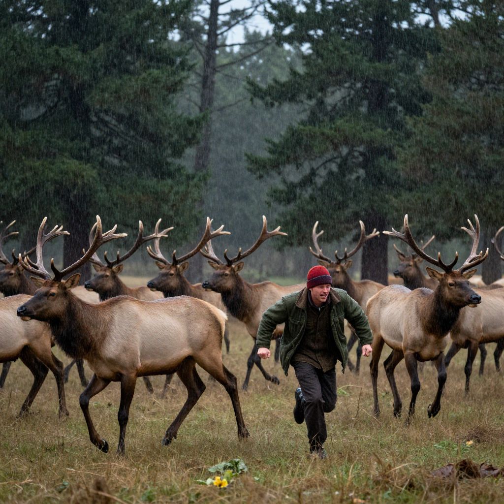 In a dramatic scene, a man in a green jacket and red hat is energetically running through a wet field, pursued by a large herd of elk. The elk, with their distinctive brown coats and large antlers, are scattered across the field, some closer to the man and others further away, creating a sense of urgency and movement. The field is drenched in rain, with droplets visible in the air, adding to the intensity of the moment. In the background, tall, dark green trees rise, their silhouettes contrasting against the overcast sky. The overall composition is dynamic, with the man and elk positioned in the foreground, while the trees provide a sense of depth and scale. The interplay of colors—green, brown, and gray—creates a moody atmosphere, enhanced by the wet surfaces and the rain.