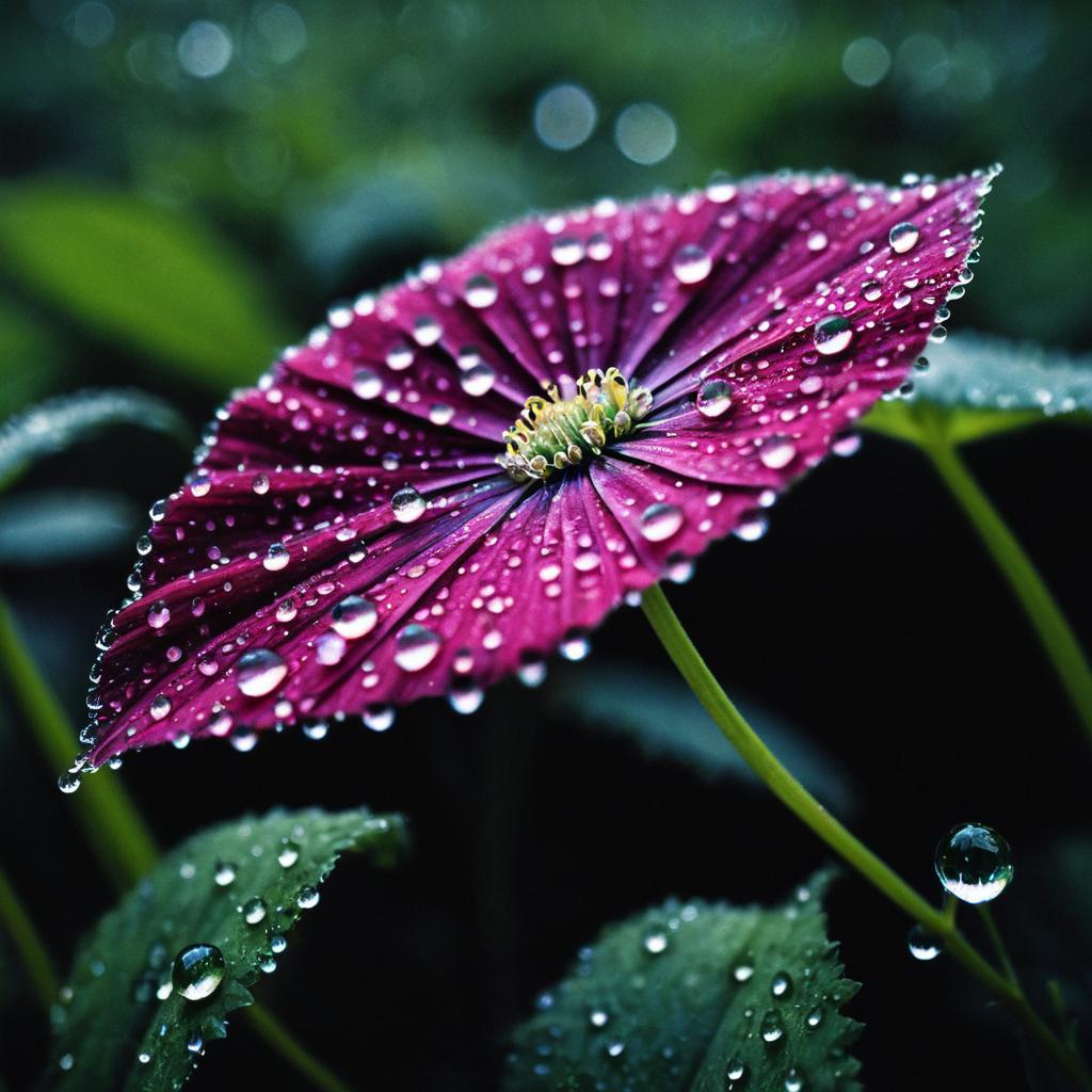 A macro photo of intricate dewdrops on a vibrant flower petal in quiet woodland at early morning, showcasing detailed, soft focus photography.