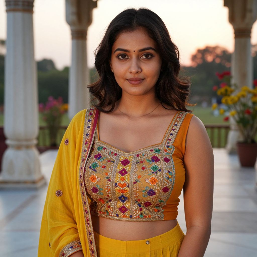 Photograph of a young South Asian woman with medium skin tone and long dark hair, wearing a yellow embroidered crop top and matching saree, standing outdoors