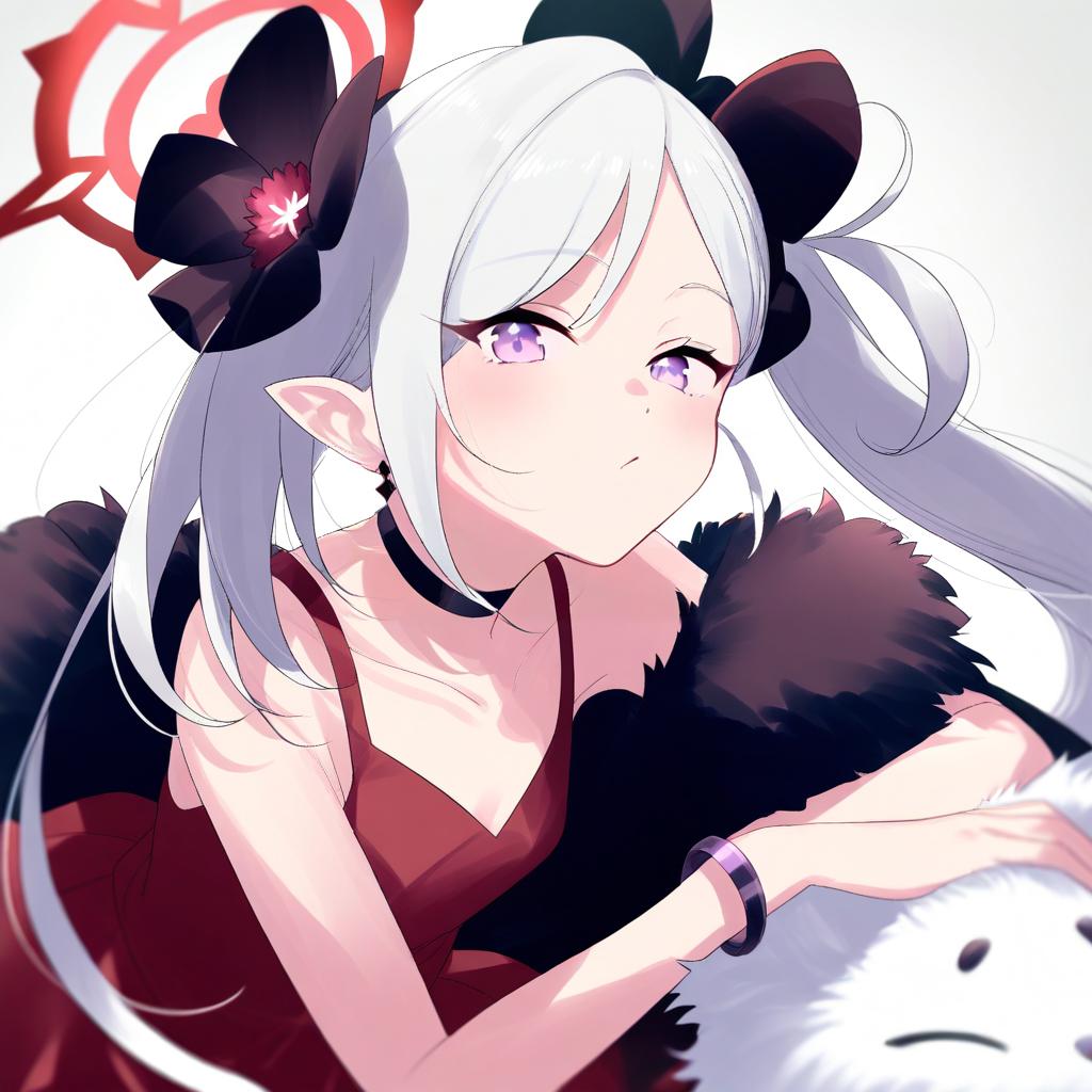 Digital anime-style illustration of a white-haired, purple-eyed female character with elf-like ears. She wears a red, strapless dress adorned with black fur-like embellishments and a large black bow with a red gem at the center in her hair. A black choker and bracelet complete her outfit. Her expression is calm, and she rests her right arm on a black furry surface. The background is white with a red, circular pattern partially visible behind her head. The overall color palette is stark, with high contrast between the white background and dark elements of her attire.