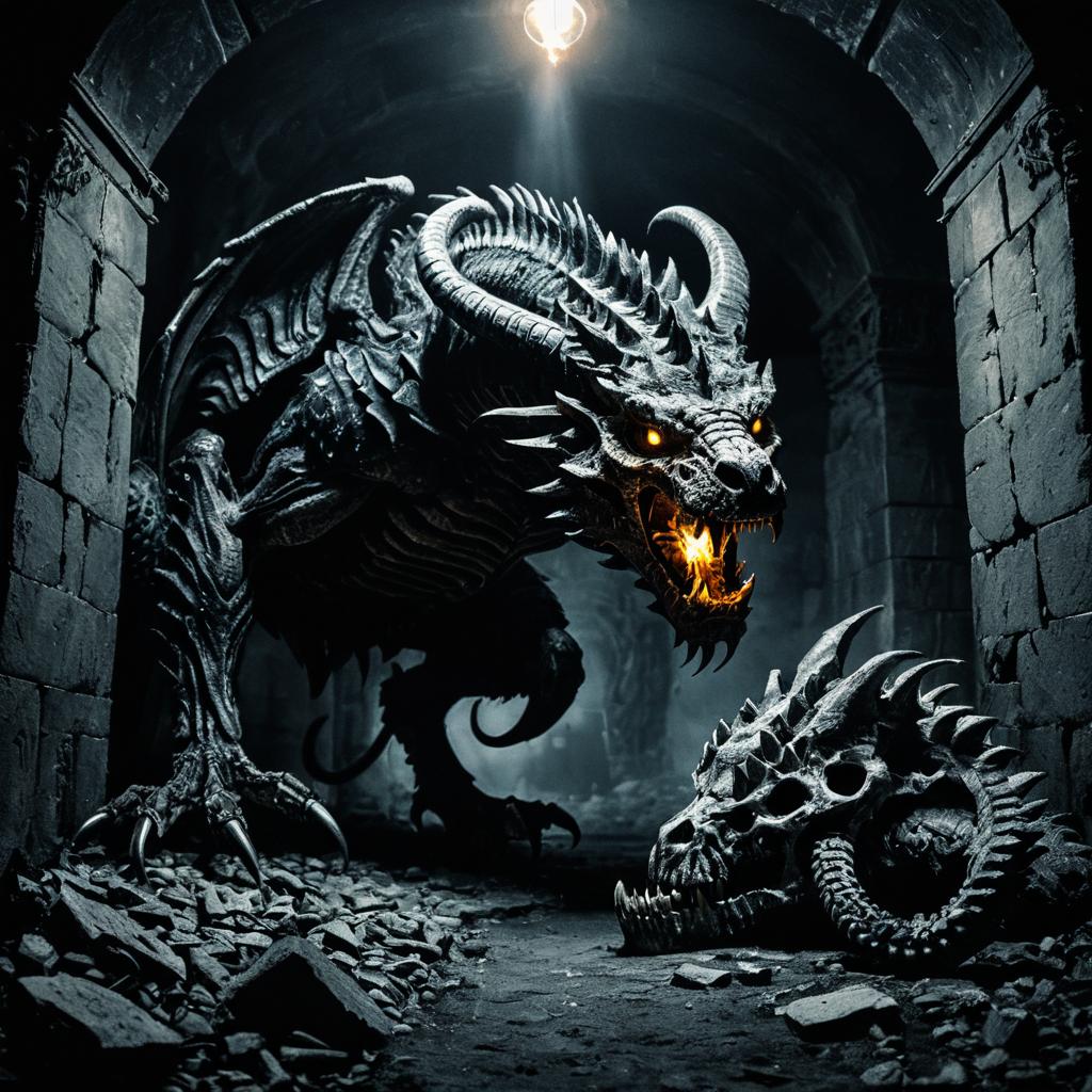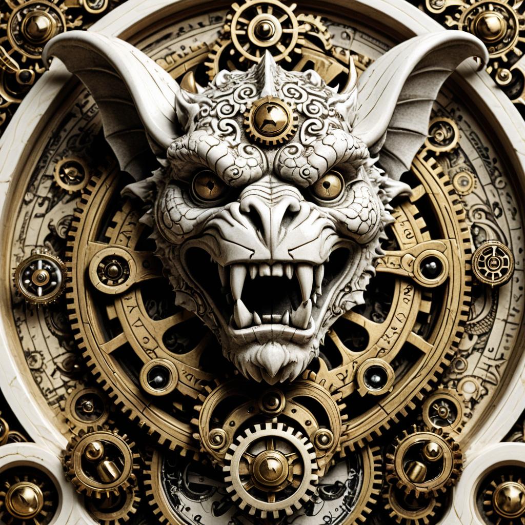 Realistic 3D render of ornately carved rococo gargoyle infused with steampunk elements, with delicate scrimshaw pattern of alchemical symbols, brass gears, bone and ivory texture, octane render, hyper-detailed