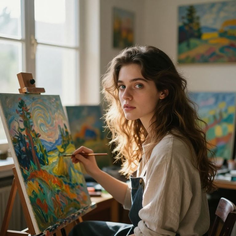 Envision a photorealistic portrait of a young female artist with flowing locks and piercing eyes, set against her sunlit studio. Vibrant impressionist paintings surround her, complementing the warm ambiance. The adjacent window's soft light illuminates her face as she intently observes one of her own landscapes—a swirling symphony of colors and forms. Her expression, serene yet focused, hints at a deep connection to art and nature's mysteries. This image invites viewers into her world, a realm of boundless creativity and introspection.