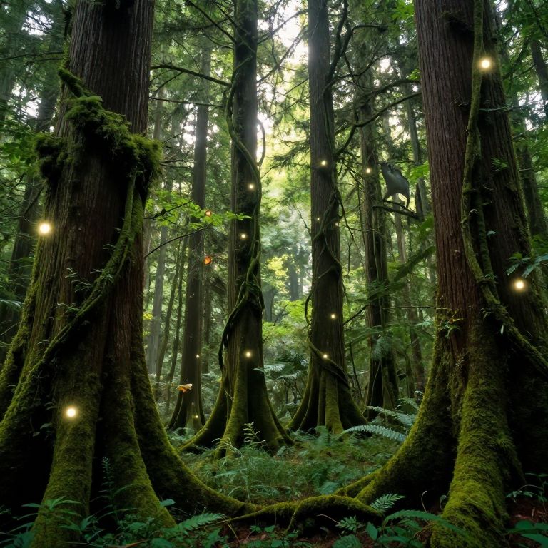 Reagea ancient forest scene, towering moss-covered trees with sunlight filtering through dense foliage, mystical creatures hidden among thick vines, soft glowing orbs floating around, peaceful and enchanted woodland ambiance.