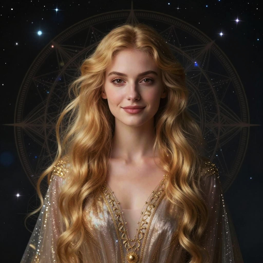 Realistic photo.Celestial being, divine, long golden hair, strikingly beautiful face, deep brown eyes, peaceful smile, slender silhouette, floating amidst stars. Art style inspired by Geoffroy Thoorens. Stunning depth, double exposure effect, surreal elements, geometric patterns, and intricate detailing. Bokeh, finely balanced with deep borders. Artistic photorealism, smooth texture, and masterful execution. realistic photo