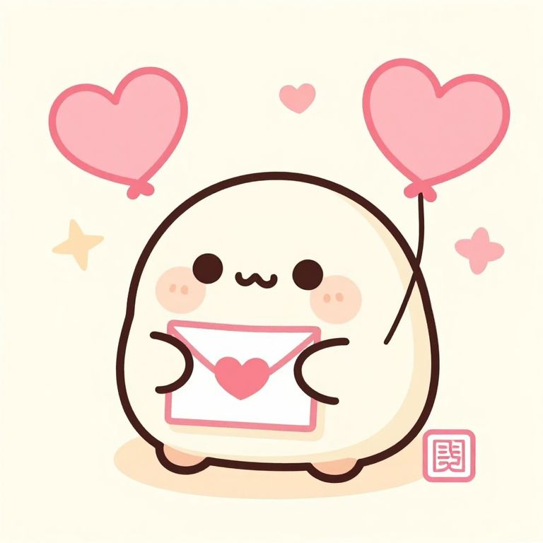 A cute mochi character holding a love letter, with a heart balloon and a pink stamp, in a Japanese style, all in 4K resolution.