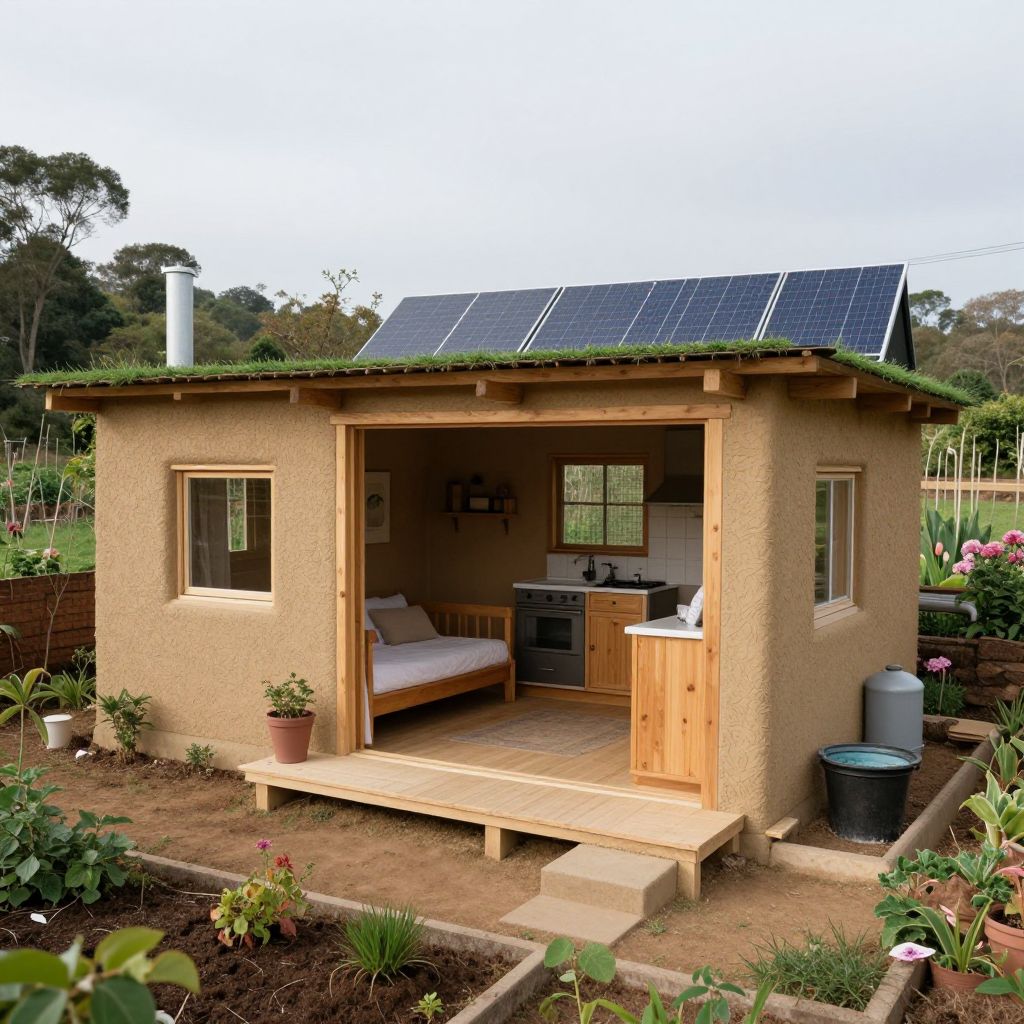 The image depicts a small, earth-friendly home for two adults, inspired by the principles outlined in \"The Barefoot Architect.\" This cozy, sustainable dwelling is designed to minimize its environmental impact, featuring a simple, open floor plan with one bedroom, a living area, a kitchen, and a bathroom, all occupying approximately 400-600 square feet. The structure is built using locally sourced, natural materials like adobe, cob, or rammed earth, promoting energy efficiency and a low carbon footprint. The house employs passive solar design principles, with south-facing windows and proper insulation to optimize natural light and warmth during winter months while keeping the interior cool in the summer. A green roof and rainwater harvesting system contribute to efficient water management, while photovoltaic panels and solar water heaters provide clean, renewable energy. The house is surrounded by a permaculture garden, providing food and promoting biodiversity. Overall, this small, earth-friendly home combines traditional and innovative building techniques to create a comfortable, self-sufficient, and sustainable living space.