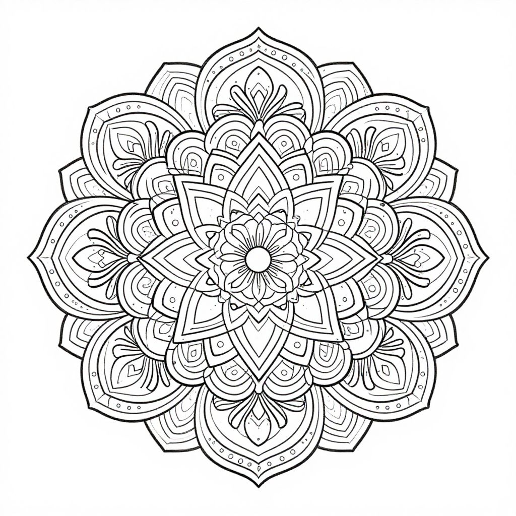 This is a black-and-white digital line drawing of a highly intricate, symmetrical mandala. The design features multiple layers of detailed, petal-like shapes with various textures and patterns, including curved lines, dots, and small circles. The mandala is circular and radiates outward from a central point, with each layer adding complexity and depth. The lines are bold and consistent, creating a sense of unity and balance. The background is plain white, which makes the black lines stand out prominently. The overall style is reminiscent of traditional Indian mandala art but with a modern, clean digital execution.