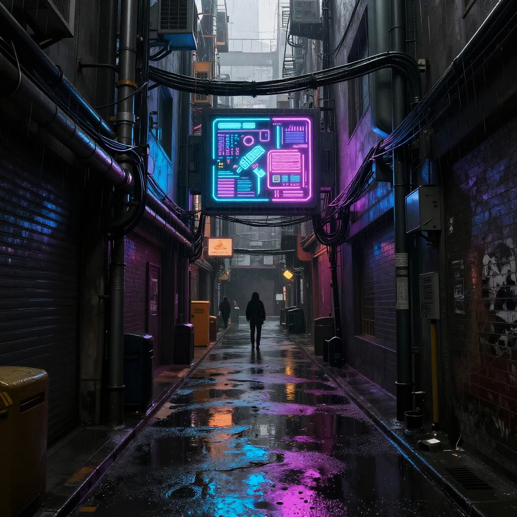 Alleyway background drawing illustrating a futuristic cyberpunk alley with glowing holographic advertisements, rain-soaked metal surfaces, pipes and cables snaking along the walls, and shadowy figures in the distance, rendered with high contrast and vivid details highlighting urban decay and technology.