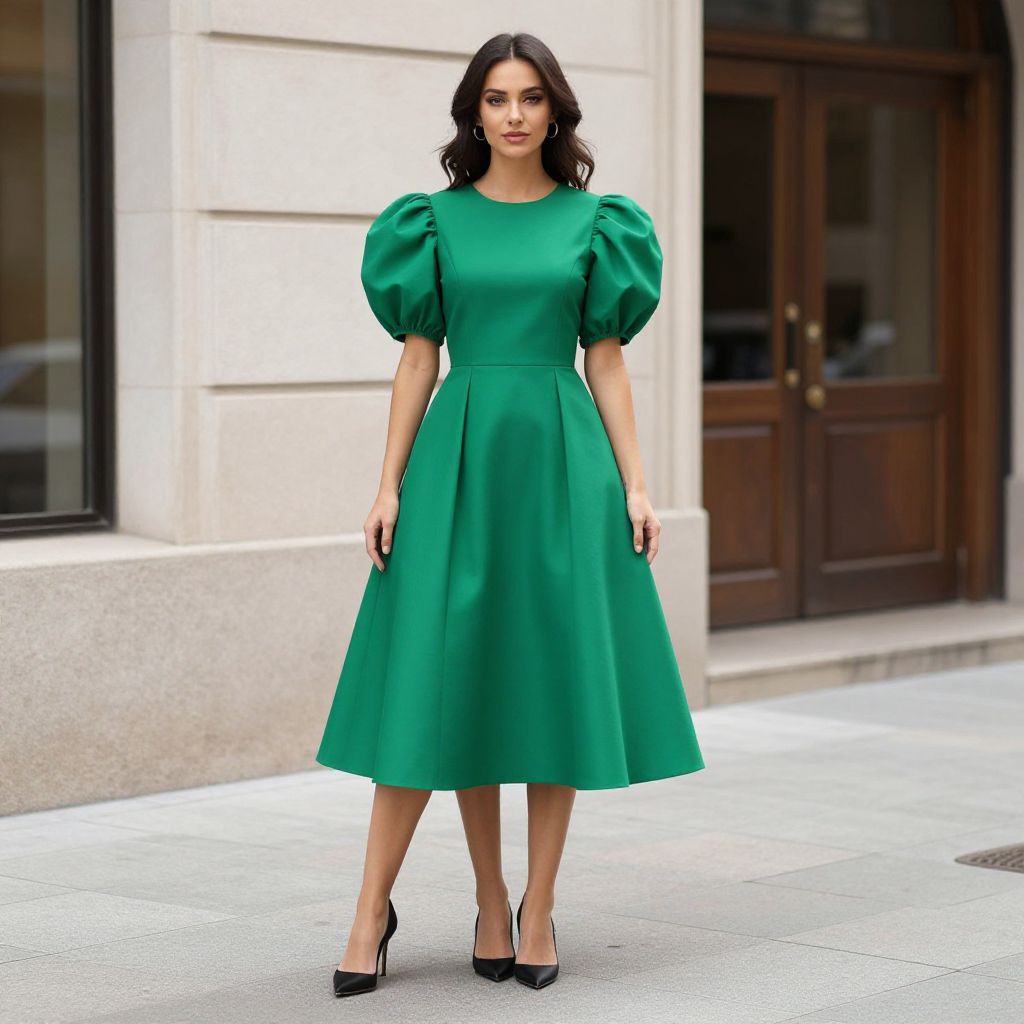 Photograph of a dark-haired woman in a vibrant green, puffed-sleeve, knee-length dress and black heels, standing on a city street