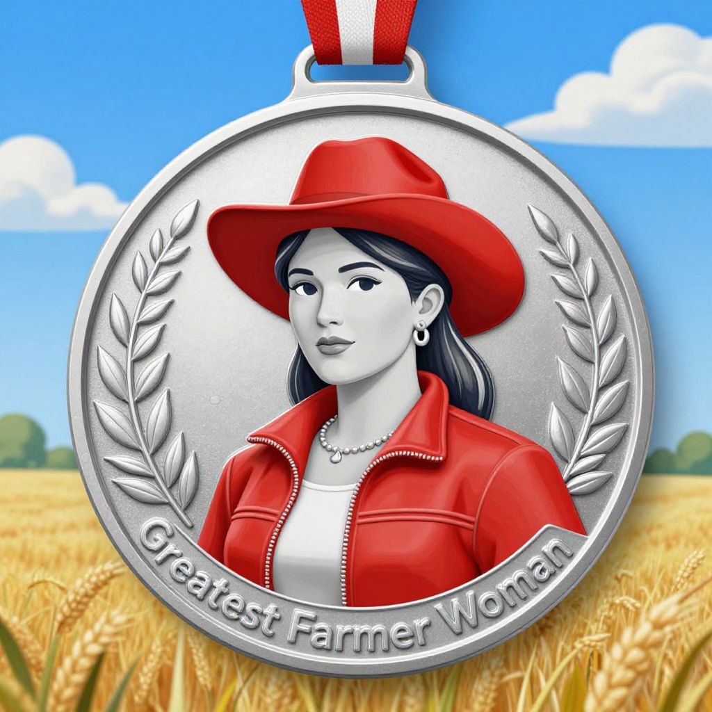 A silver medal illustration featuring a woman in a red hat and jacket, with a field and clouds in the background, labeled \"Greatest Farmer Woman.\