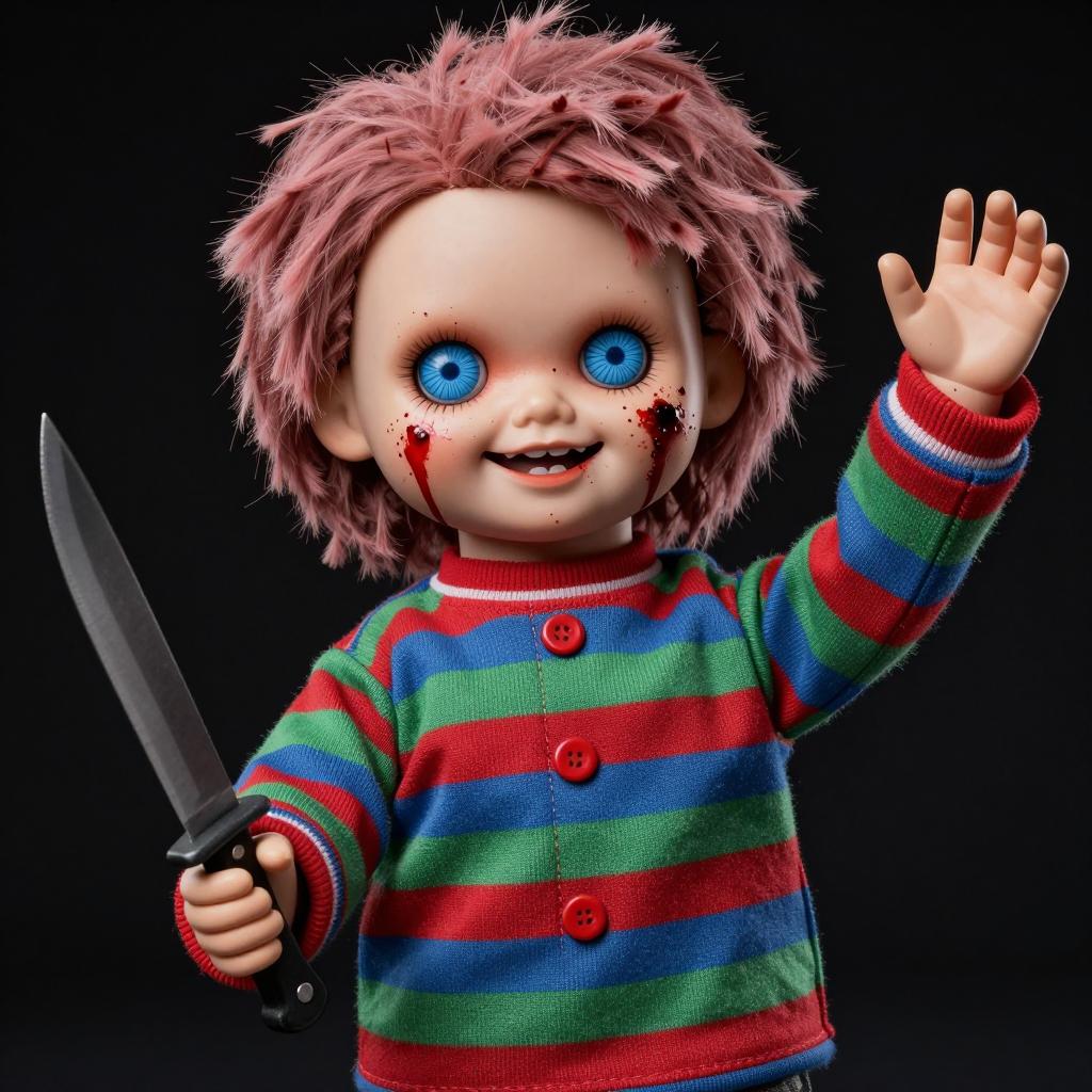 Scarecrow-like doll with pink, messy hair and blue eyes, wearing a striped red, green, and blue shirt with red buttons, holding a small, sharp knife in its right hand. Black background. Blood on doll's face and shirt. Doll's face has a menacing smile. Doll's left arm raised.