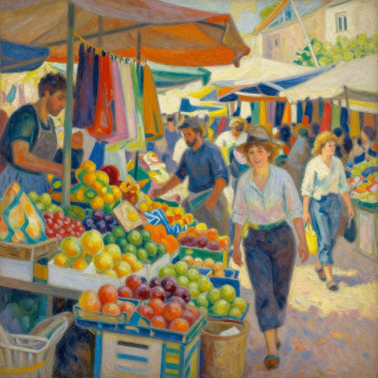 Vibrant impressionist painting of a bustling outdoor market with colorful fruit stalls, shoppers, and umbrellas under bright sunlight.