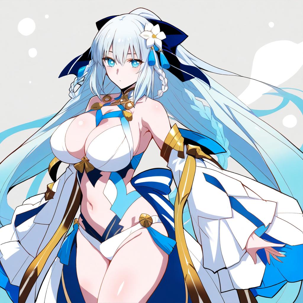 Morgan le fay (water princess) (fate), fate/grand order, 1girl, blue eyes, very long hair, white hair, grey hair, blue hair, ponytail, sidelocks, twin braids, french braid, hair flower, hair ribbon, large breasts, cleavage, thighs, navel, white bikini, bare shoulders, detached sleeves, puffy long sleeves, gold trim, by artist sako (bosscoffee), animagine