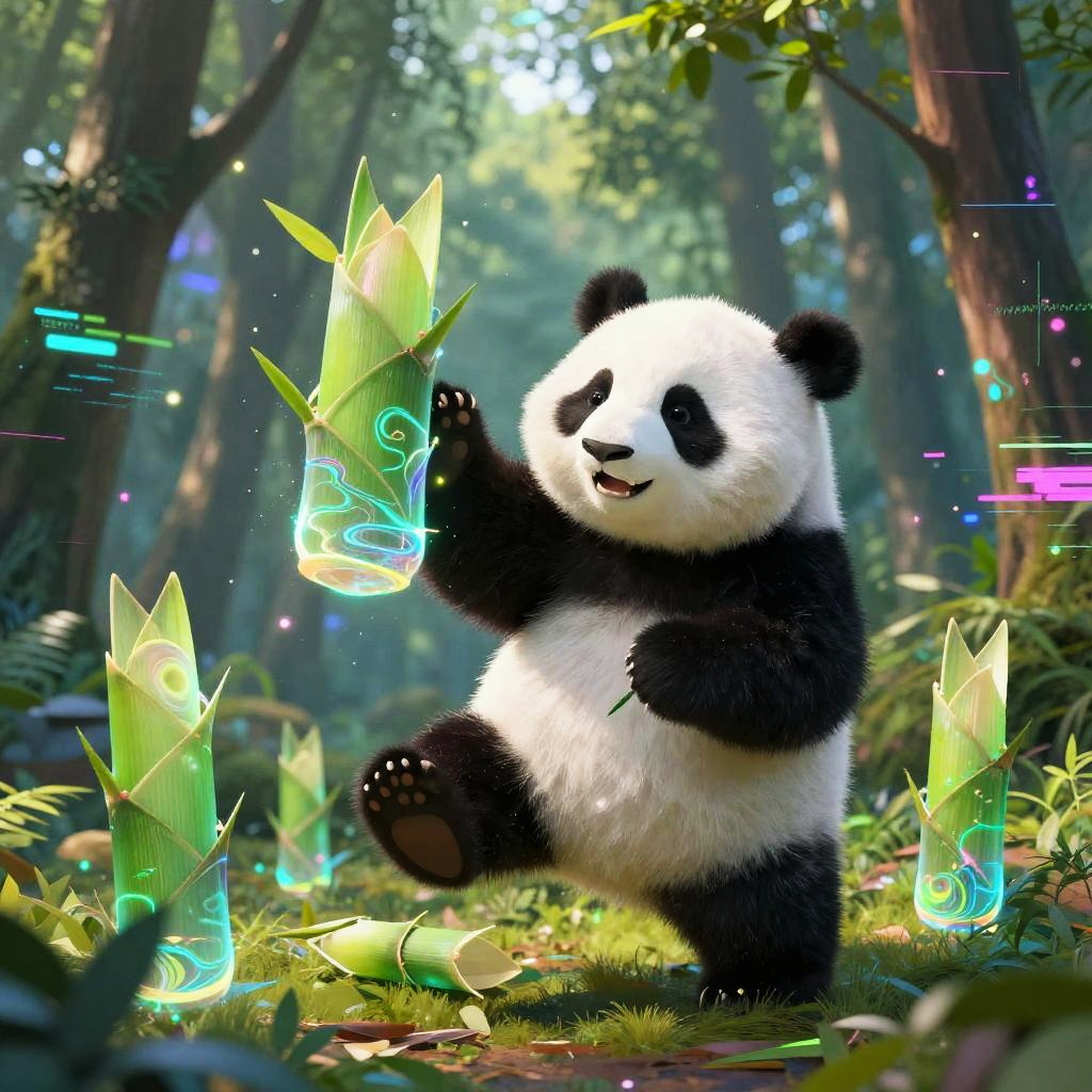 Digital illustration of a cute, chubby panda standing in a lush, sunlit forest. The panda, with black and white fur, is holding a green bamboo stalk in its right paw and has a joyful expression with its mouth slightly open. The background features tall trees, dense foliage, and sunlight filtering through the leaves, creating a magical atmosphere. The forest floor is covered in green plants, large leaves, and colorful flower buds. The image has a whimsical, cartoon-like style with vibrant colors and soft textures.