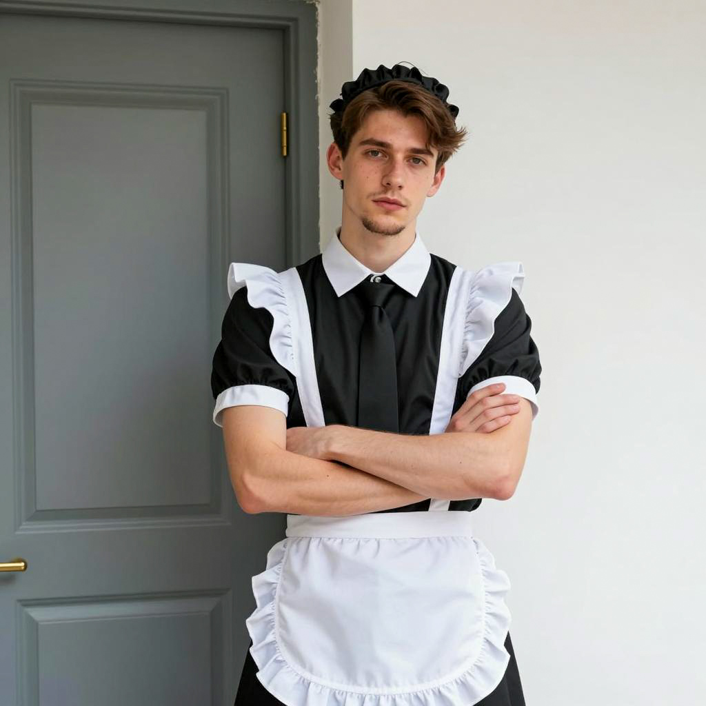 Man french maid costume, photograph of a handsome young man, standing in front of a door, wearing a classic French maid outfit, black and white, ruffled sleeves, black apron, black necktie, black headpiece, short brown hair, slight beard, light skin, crossed arms, neutral expression, soft daylight, minimalist background, door on the left, white wall on the right, elegant and simple, clean lines, traditional maid attire, modern twist, casual yet formal, balanced composition, portrait orientation