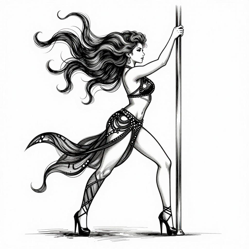 Detailed line art illustration of a seductive pole dancer with asymmetric, flowing hair and an intricate silhouette. The dancer is holding a pole, wearing a provocative black outfit and high heels. Fluid, swirling lines emphasize movement and the wind blowing through her hair.