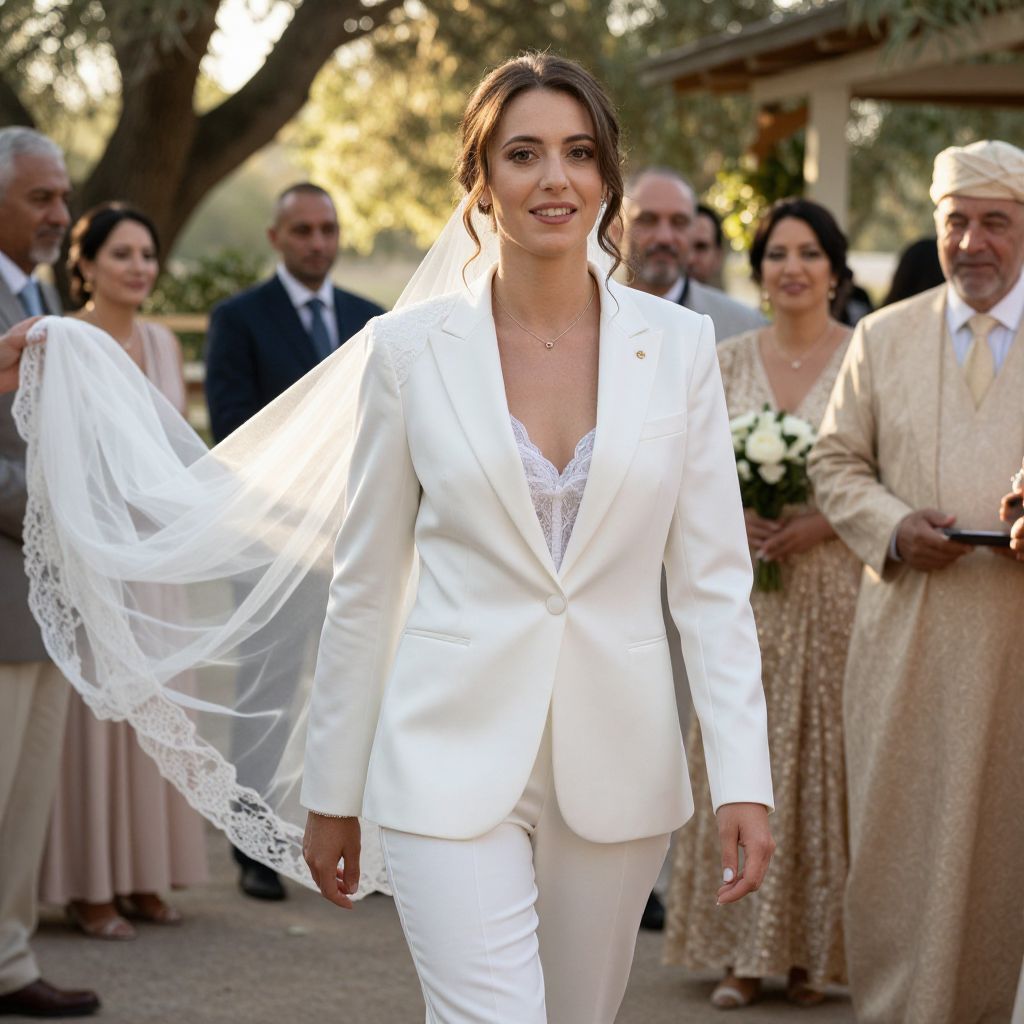Photograph of a smiling bride in a white suit and lace veil, walking outdoors at a wedding, with guests in formal attire in the background.