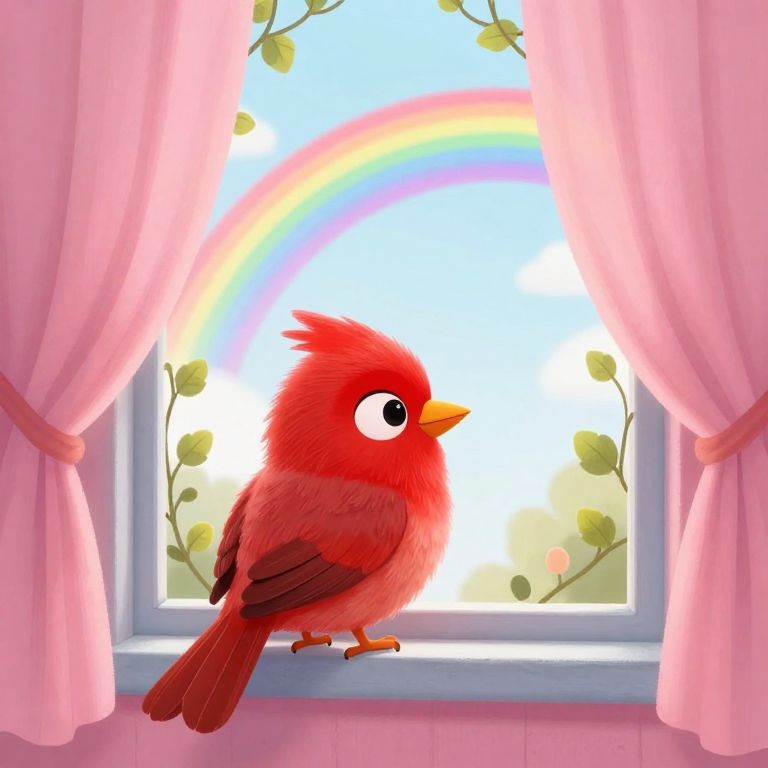 A cute, cartoon-like bird with a pink and blue color scheme is perched on a windowsill, looking out at a colorful rainbow outside the window.