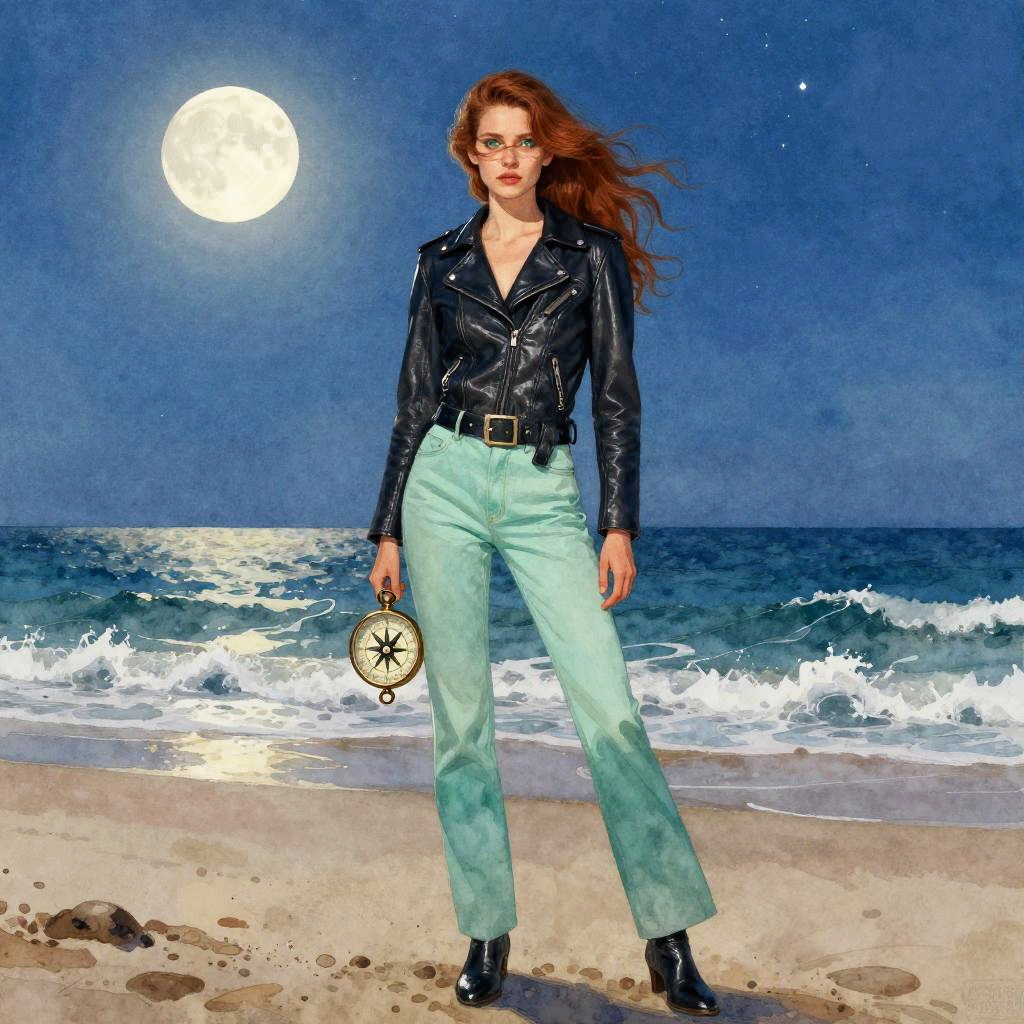 Wide shot, 1person, solo, tall and poised with emerald eyes partially hidden behind windblown chestnut hair, wearing a sleek leather jacket paired with seafoam trousers, standing on a moonlit beach, standing firm with one foot slightly forward, clutching a weathered captain's compass, starry sky, full moon, tranquil ocean waves, watercolor painting style, blue background