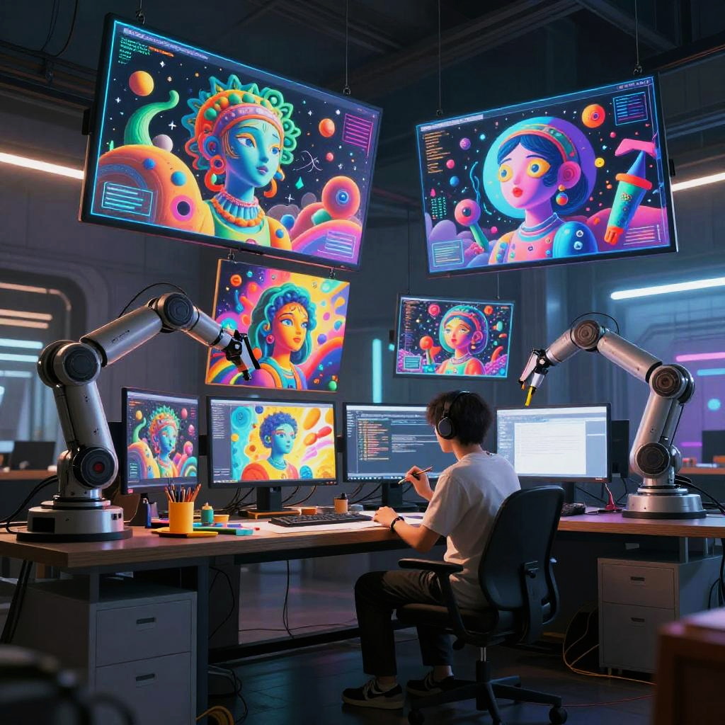 Picture generator AI visualizing a futuristic artist's studio, screens displaying vibrant AI-generated artwork, robotic arms painting colorful surreal images, holographic projections, cyberpunk aesthetic, dynamic composition, detailed environment, neon accents