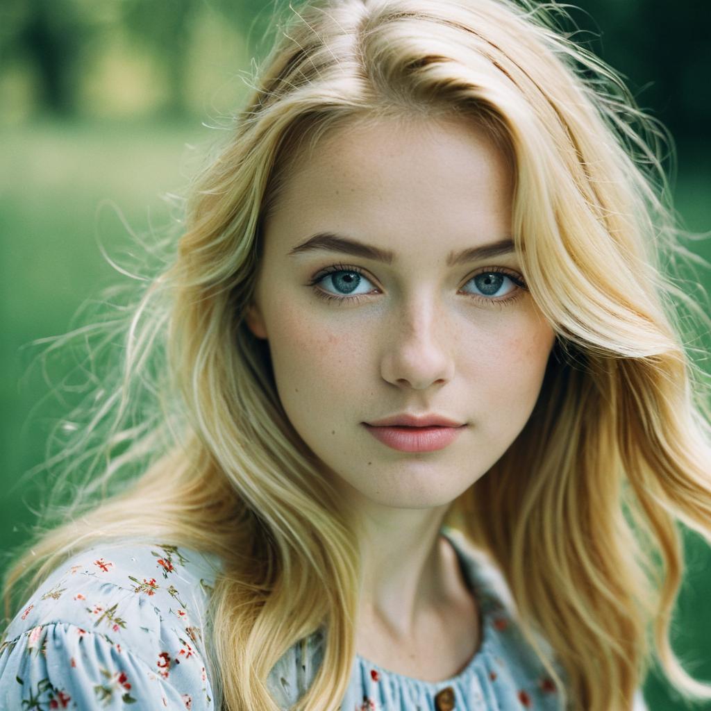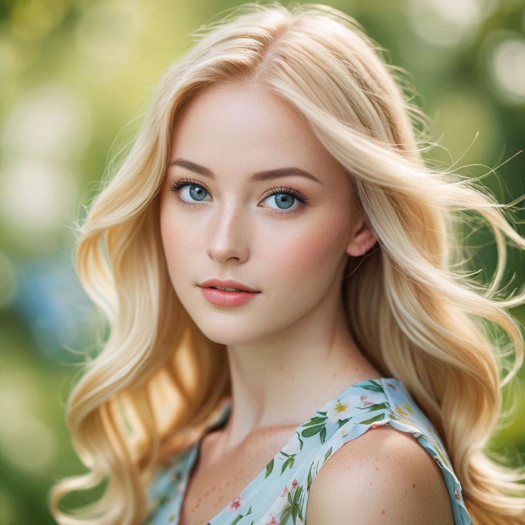 A close-up portrait of a young woman with blonde hair and blue eyes, natural facial freckles, soft flowing hair, wearing a light floral dress, photographed outdoors with soft natural lighting and a blurred green background, realistic and gentle mood