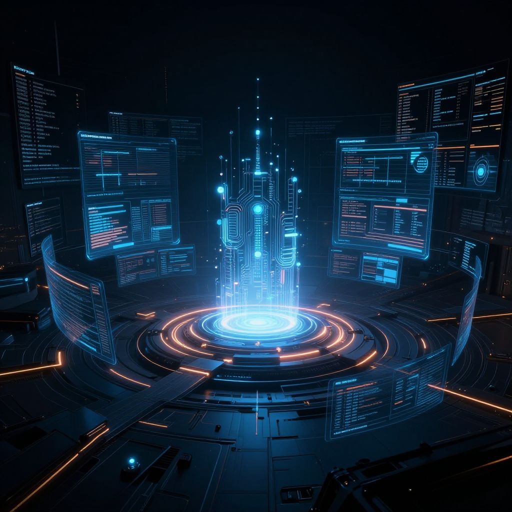 Skybox AI controlling a vast virtual environment, displaying complex data streams and holographic interfaces around a central AI core, cybernetic patterns, dark mode with blue and orange highlights, sci-fi concept art
