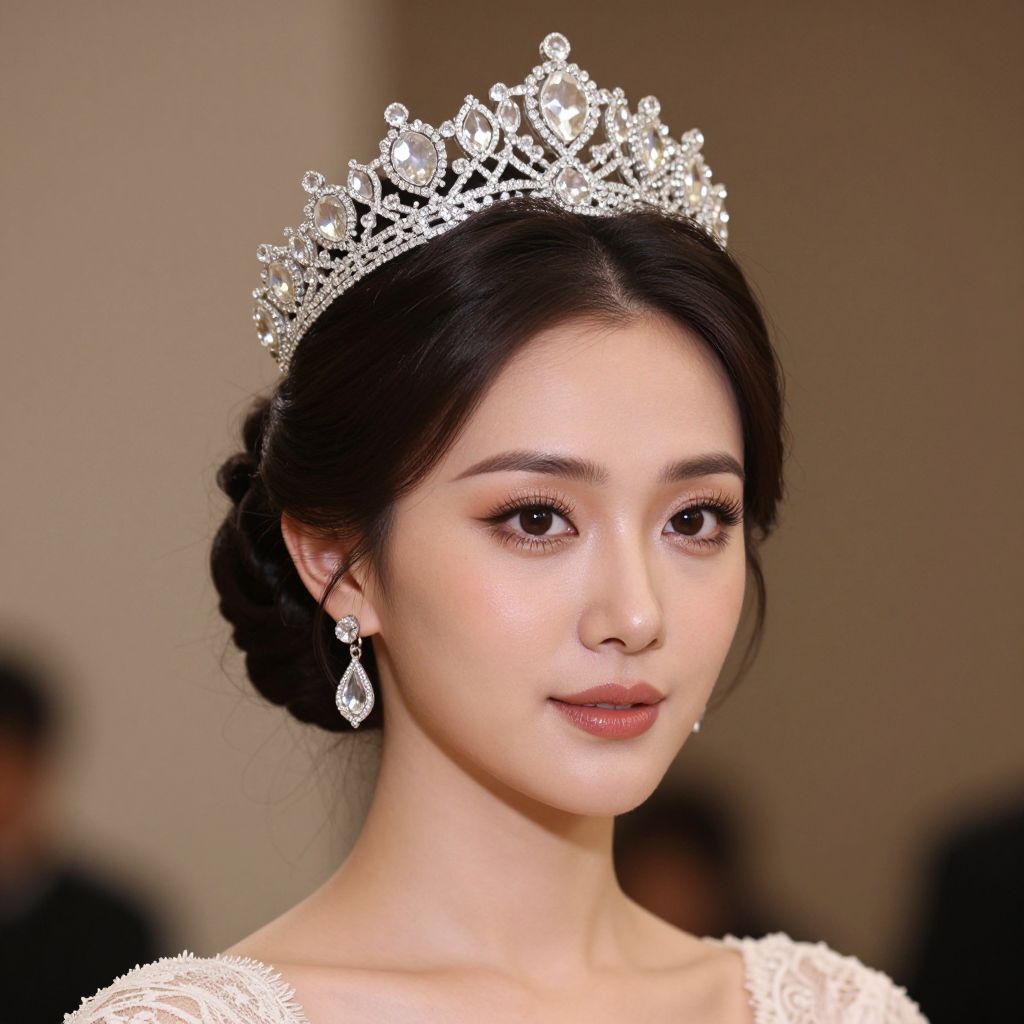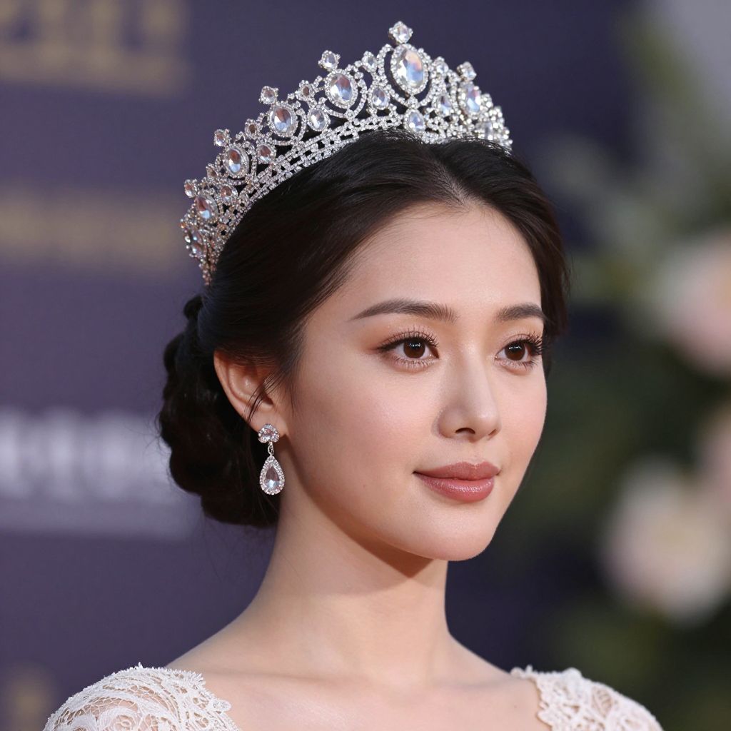 Radiant woman wearing a sparkling silver tiara adorned with intricate water drop zircon designs, complemented by elegant earrings and a lace dress, exudes grace and beauty at a wedding or formal event.