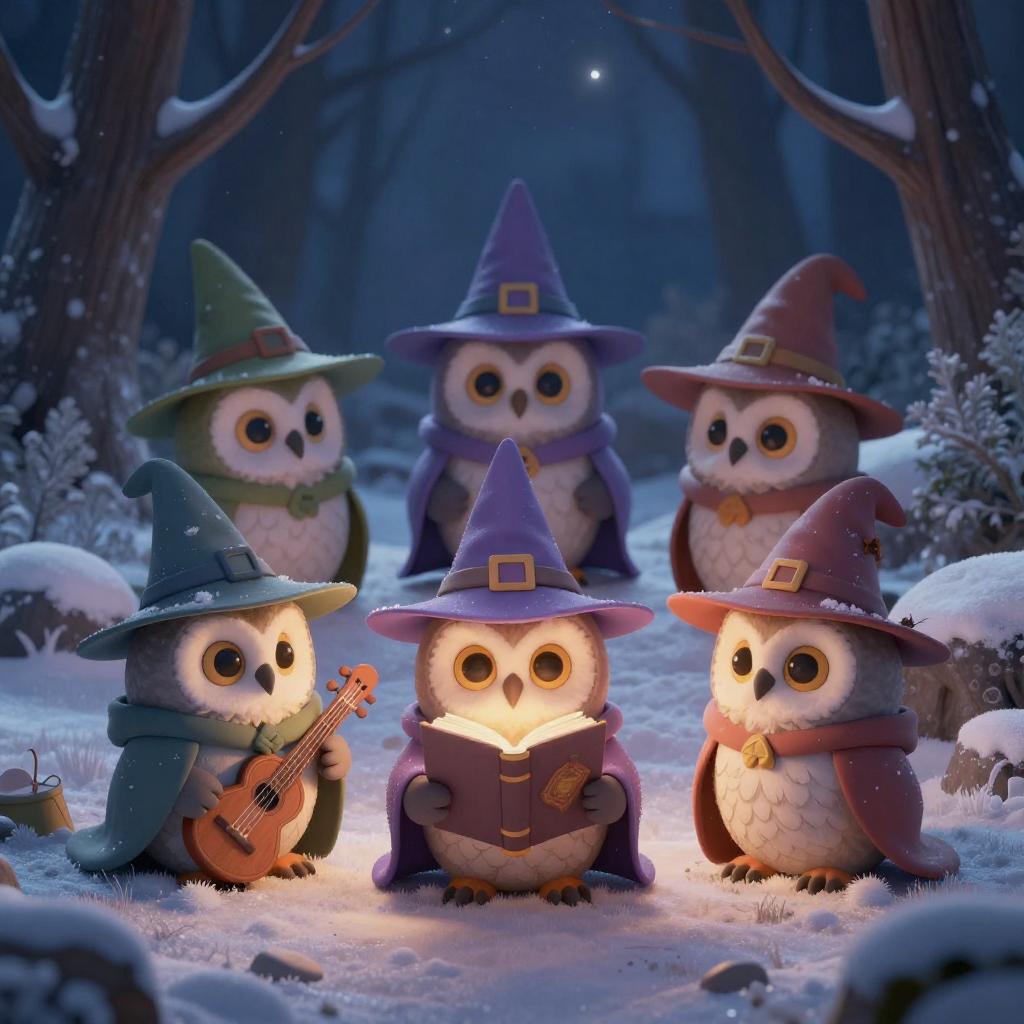 This whimsical, digital illustration depicts five owls dressed as wizards sitting in a snowy forest at night. They wear colorful, pointed hats and robes, each holding a musical instrument or book. The owls have wide, expressive eyes and are illuminated by soft, moonlit glow. The camera angle is slightly above eye level, with a shallow depth of field that keeps the owls in sharp focus while the background of snow-covered trees and a starry sky is gently blurred.